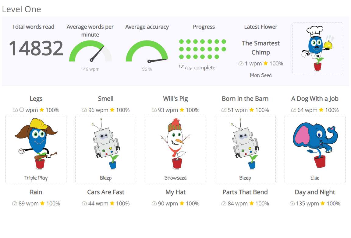 With any goal-oriented reading program it is essential to provide students with detailed information about where they are at present and where they ought to be by the end of the year. Read Seed’s student dashboard displays how much they’ve read, their average words per minute, and their average accuracy. For each reading they complete students are rewarded with a fun seed character.