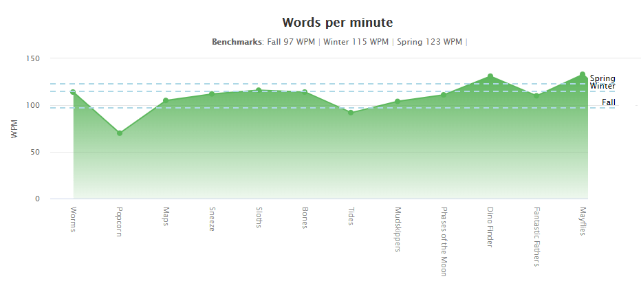 In monitoring reading progress, it is important to evaluate students by referencing an external standard of achievement. Read Seed provides words per minute benchmarks suited to the learner’s age and reading level. Fall, Winter, and Spring benchmarks are clearly displayed for the teacher’s reference. Students who consistently fail to reach the benchmarks are candidates for further intervention. Read Seed reports also serve as a means of assessing the effectiveness of an intervention.